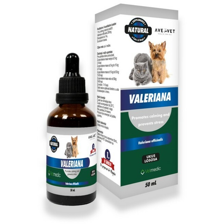 Opis: Valeriana je oralni rastvor namenjen ublažavanju simptoma stresa, ankcioznosti, agresije i svih vrsta poremećaja u ponašanju pasa i mačaka, uključujući strah od grmljevine i vatrometa, stres tokom transporta, posete veterinaru, promena u kući i novih članova domaćinstva. Pre upotrebe dobro promućkati. Za pse telesne mase manje od 5kg: 3-4 kapi; Za pse telesne mase od 5kg do 15kg: 4-15 kapi; Za pse telesne mase od 15kg do 50kg: 15-30 kapi; Za pse telesne mase veće od 50kg: 30-60 kapi; Za mačke: 7-15 kapi. Aplikovati direktno u usta ili dodavanjem u hranu.